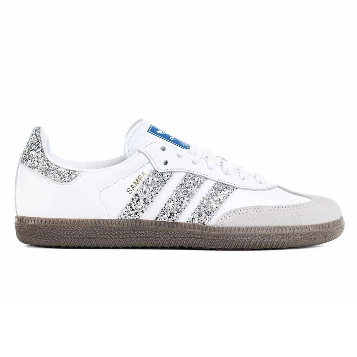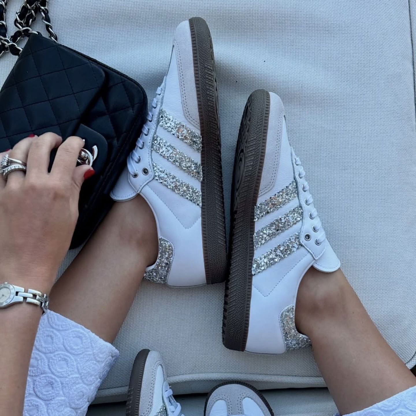 El clásico de siempre, pero con un toque distinto. Agarramos las Samba blancas y les sumamos un detalle único: glitter plateado que hace que brillen en cada paso.