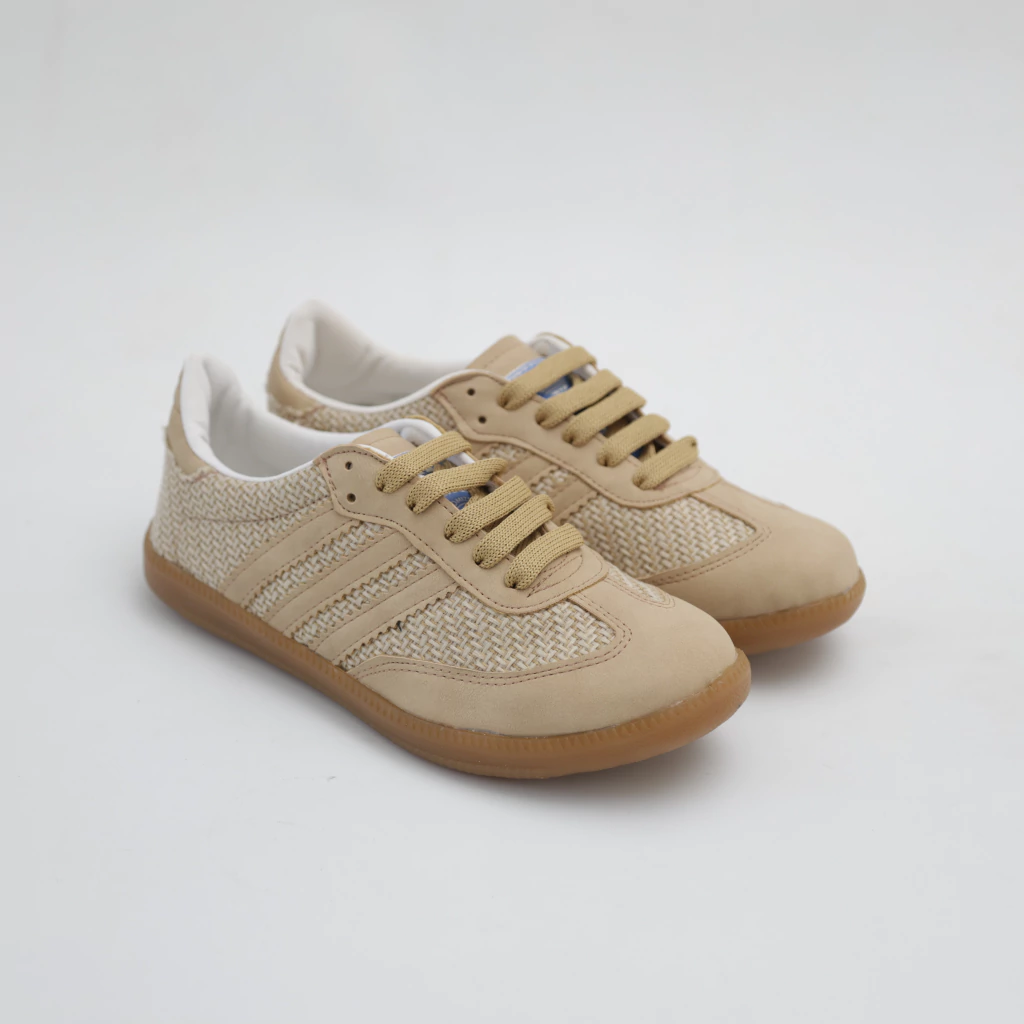 Tomamos el clásico modelo Adidas Samba y lo transformamos en algo único. Este par fue intervenido por nosotros, reemplazando el exterior tradicional por un diseño con tejido artesanal en tono natural, combinado con detalles de cuero beige y suela de goma original.